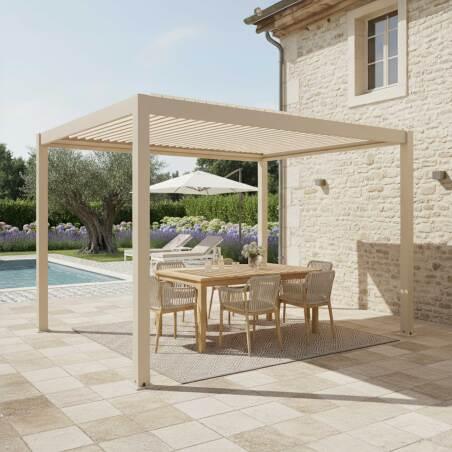Trasforma il tuo spazio esterno con la pergola bioclimatica autoportante Athens, disponibile in crema e in tre dimensioni, o in grigio antracite per il formato 4x3 m. Ideale per il tuo patio o giardino, questa pergola di alta qualità diventerà la cornice perfetta per i tuoi pasti e i tuoi momenti di relax. Le sue 32 lame orientabili a 90°, orientabili manualmente (con una o due motorizzate a seconda del modello), permettono di controllare la luce solare e la ventilazione. La sua struttura autoportante è fissata a terra, offrendo totale libertà per creare uno spazio esterno distintivo e personalizzato. La versione crema porterà un tocco di luminosità e si armonizzerà con tutti gli stili decorativi.