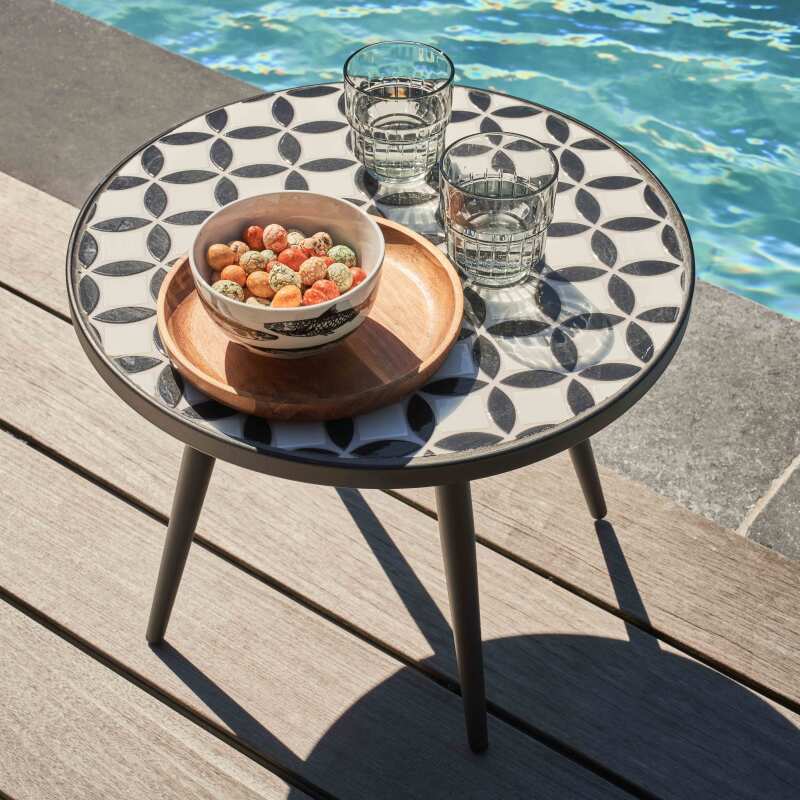 Tavolino piccolo da esterno rotondo in ceramica e metallo verniciato a polvere con motivo MOSAICO Ø45x35 cm