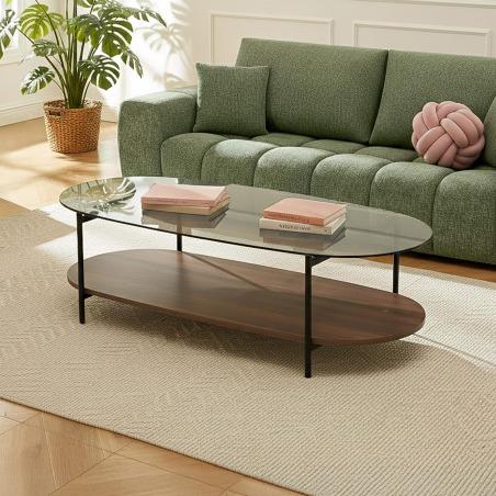 Tavolino da salotto in vetro e effetto legno scuro ovale 120 x 55 x 40 cm