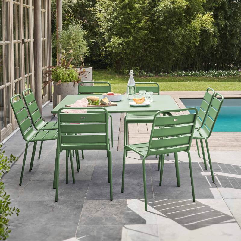 Mobili da giardino in metallo per 8 persone, con un grande tavolo quadrato e 8 sedie Palavas. Questo set di mobili da giardino a 8 posti è caratterizzato da un design leggero dalle linee pulite e da una struttura ultraresistente in acciaio al 100%. Praticamente indistruttibili, il tavolo quadrato e le 8 sedie da giardino sono trattati con vernice epossidica. Resistenti alle intemperie e ai raggi UV, il tavolo e le sedie da giardino in acciaio faranno un figurone in giardino o in terrazza. Possono essere utilizzati all'aperto tutto l'anno, senza rischi di deterioramento, e richiedono pochissima manutenzione. Le sedie in metallo possono essere impilate per risparmiare spazio una volta riposte e sono dotate di seduta e schienale forati per trattenere l'acqua piovana. Il tavolo da giardino in metallo deve essere assemblato solo per le gambe e sono inclusi tutti gli attrezzi e le istruzioni. Il tavolo e le sedie da giardino in acciaio per 8 persone hanno una garanzia di 2 anni.