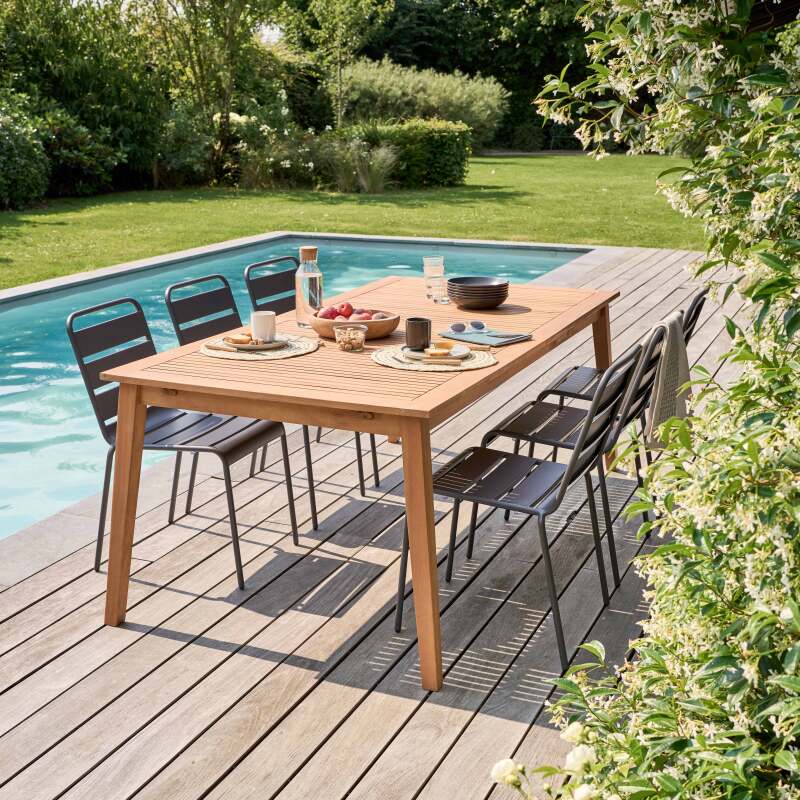 Il mobile da giardino allungabile in legno CHICAGO è composto da un tavolo in eucalipto e 6 sedie in metallo. Consegnato con 6 sedie in acciaio, il tavolo è allungabile e può ospitare fino a 8 persone quando il piano è completamente aperto. Le sedie sono impilabili, sono realizzate in acciaio rivestito con vernice epossidica per evitare ogni traccia di ruggine nel tempo. Il tavolo è realizzato in legno di eucalipto certificato FSC® 100%, trattato per resistere alle aggressioni esterne e mantenere il colore originale il più a lungo possibile. Il livello di umidità è controllato in diverse fasi della produzione per garantire che il legno sia completamente asciutto e non subisca alcun danno. Possibilità di aggiungere sedie con o senza braccioli della gamma Palavas in vendita sul sito Oviala.
