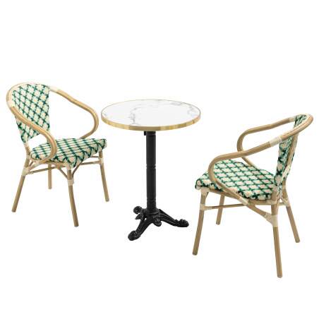 Trasforma il tuo spazio esterno con il nostro set di tavoli da patio quadrati, unendo eleganza e funzionalità. Il tavolo, con un diametro di 60 cm, è realizzato in compensato di alta qualità, con un rivestimento in laminato che imita l'effetto marmo e un bordo in alluminio dorato che gli conferisce un aspetto chic. Il suo design robusto comprende una gamba in ghisa nera, che offre un'altezza di 72 cm e un sistema di inclinazione, che ti consente di regolarlo in base alle tue esigenze. Con una base di 41,5 x 37 cm, una colonna di P. 60 x H. 55 cm e una traversa superiore di 45 x 45 cm, questo tavolo è inoltre dotato di 4 estremità regolabili per una stabilità ottimale su tutte le superfici. Accompagnato da due sedie in stile bistrot parigino, questo set fa parte di un arredamento senza tempo. Le sedie, con il loro rivestimento effetto legno, uniscono comfort ed estetica. Costruiti in alluminio, sono leggeri e resistenti, con tubi da 28 x 1,5 mm per la struttura principale e 24 x 1,2 mm per il rinforzo, garantendo una solidità infallibile. Misure H. 82 x P. 60 x l. 57 cm, offrono un'altezza della seduta di 45 cm, nonché una profondità e larghezza della seduta di 42 cm. Lo schienale da 37 cm garantisce un comodo appoggio durante i vostri pasti all'aperto. Questo set è ideale per i professionisti ma anche per i privati, progettato per un uso intensivo pur sfoggiando uno stile bistrot che porterà un tocco di convivialità sulla vostra terrazza, bar o ristorante. Offri ai tuoi clienti un'esperienza indimenticabile, dove il fascino parigino incontra il comfort moderno.